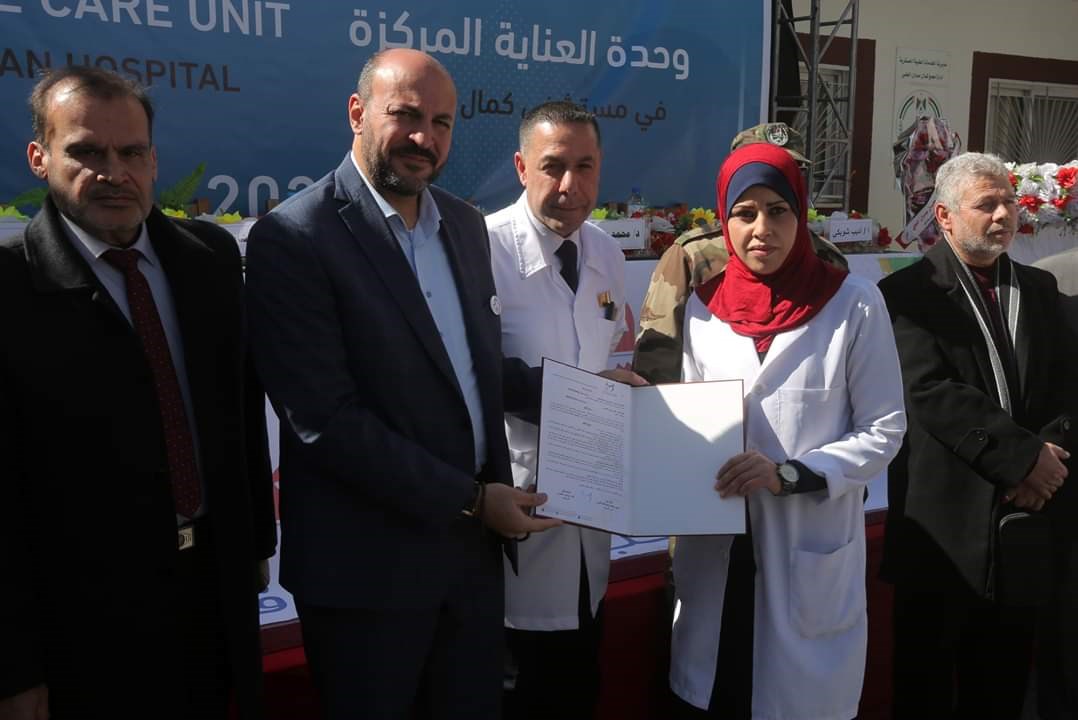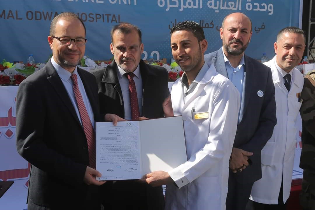 وفي ختام الافتتاح، كرمت قيادتا الداخلية والصحة الوفود والمؤسسات الداعمة، كما تم توزيع عقود عمل لـ 14 طبيباً وممرضاً ضمن طاقم قسم العناية المركزة بمجمع كمال عدوان الطبي، كما تم تفقد القسم الجديد والاطلاع على وحداته.