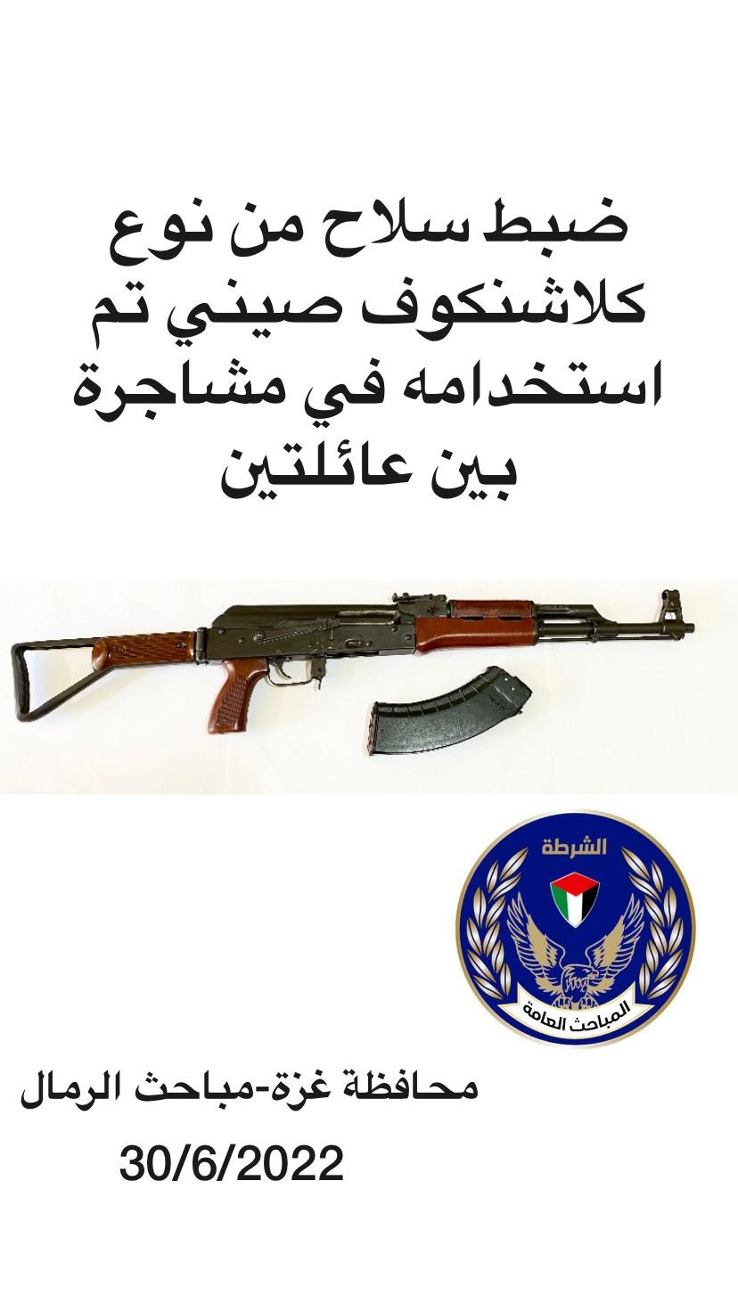 ضبطت مباحث محافظة غزة قسم مباحث مركز شرطة الزيتون، سلاح من نوع كلاشنكوف، بعد قيام المدعو محمود أحمد (د) بإطلاق النار في الهواء؛ خلال شجار عائلي بين عائلتي (د)، (ج).
