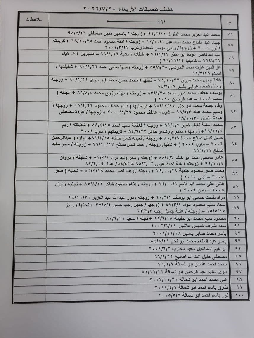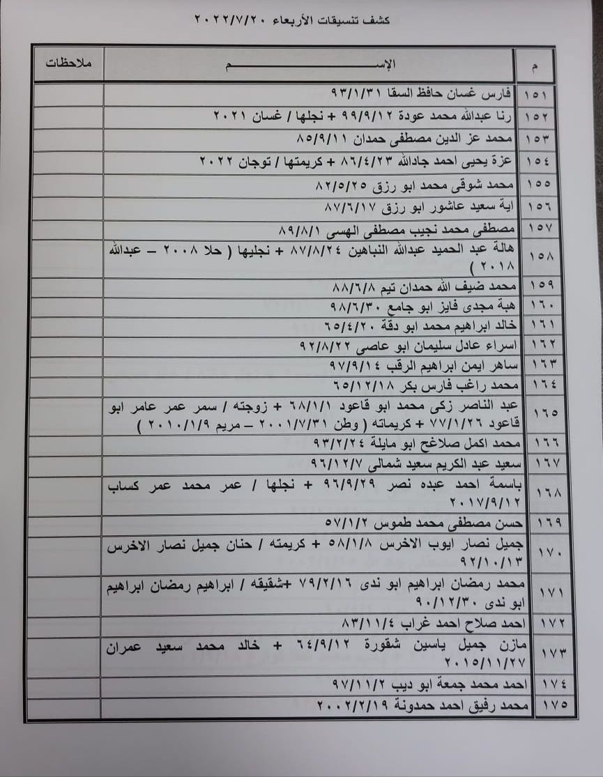تعلن الهيئة العامة للمعابر والحدود بوزارة الداخلية والأمن الوطني عن وصول كشف "تنسيقات مصرية" للسفر عبر معبر رفح البري يوم الأربعاء (20 يوليو)، والذين عليهم التواجد س 8:00 صباحاً في الصالة الخارجية للمعبر لتسهيل سفرهم.