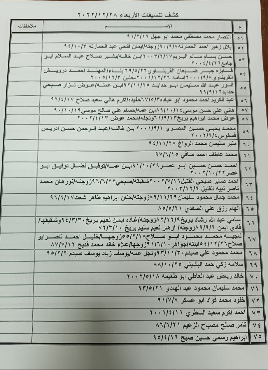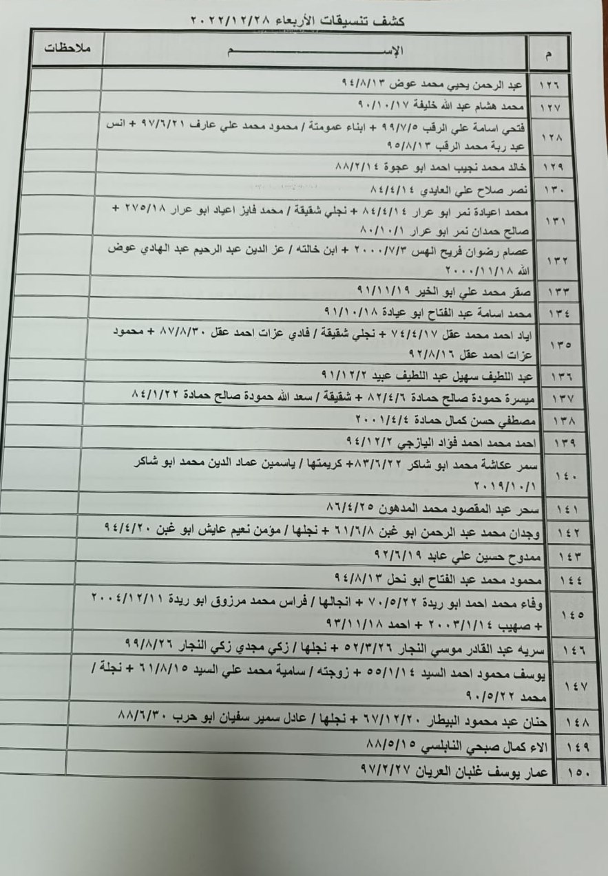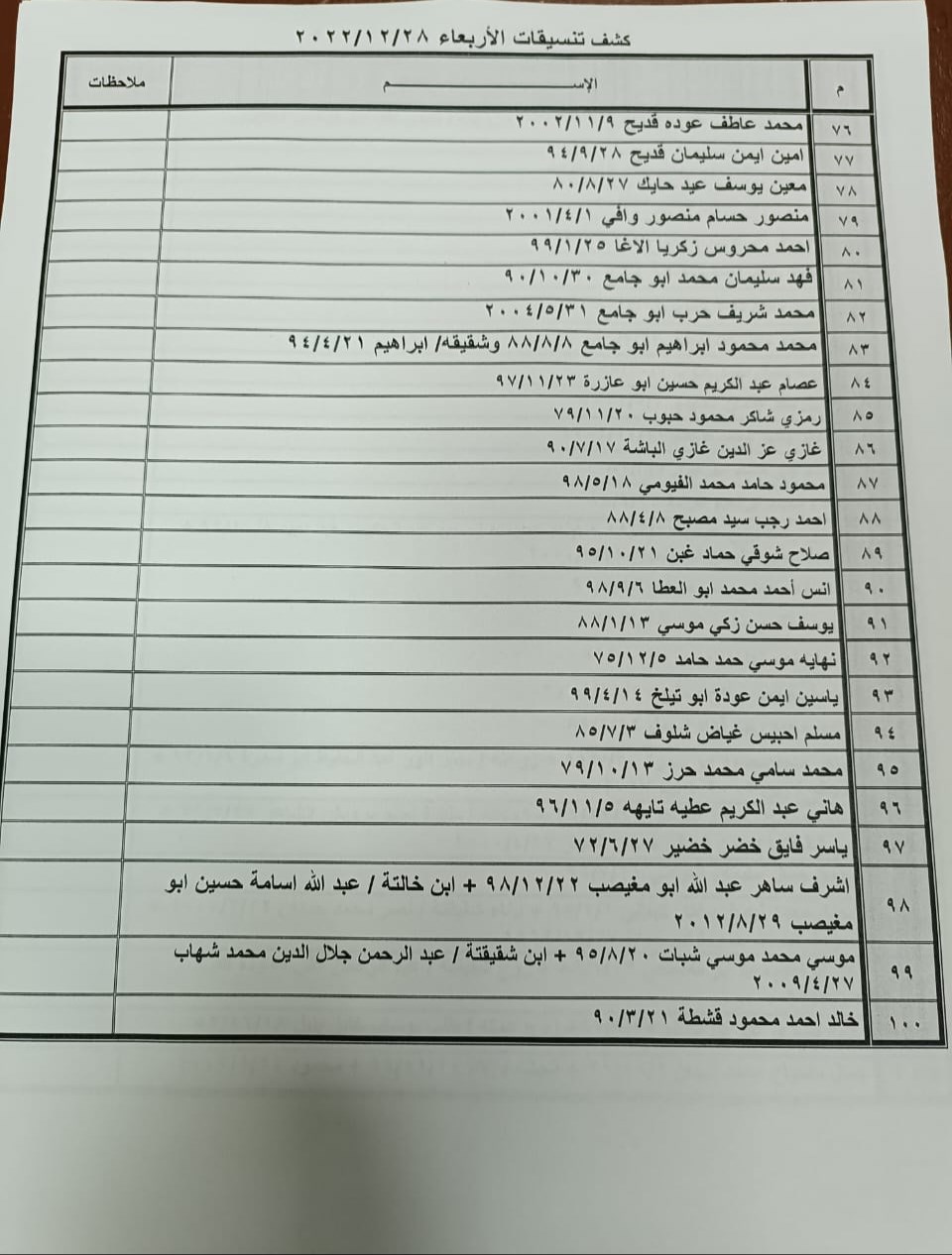 تعلن الهيئة العامة للمعابر والحدود بوزارة الداخلية والأمن الوطني عن وصول كشف "تنسيقات مصرية" للسفر عبر معبر رفح البري يوم الأربعاء (28 ديسمبر)، والذين عليهم التواجد س 7:00 صباحاً في الصالة الخارجية للمعبر لتسهيل سفرهم.