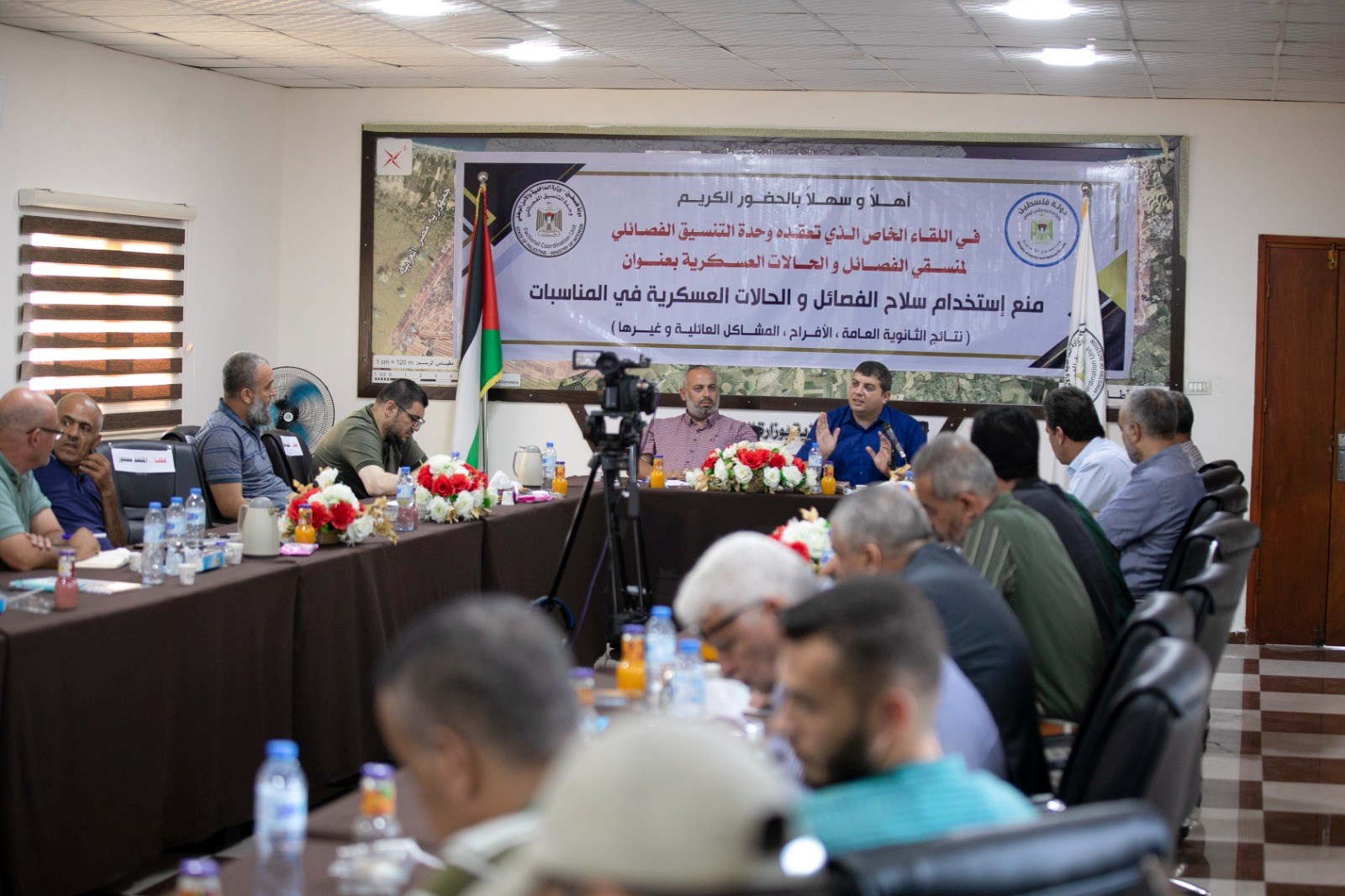 وأوضح العقيد "جلمبو" أن طواقم التنسيق الفصائلي تبذل جهوداً كبيرة، بالتنسيق مع سائر أجهزة الوزارة وإداراتها، لتحقيق مبدأ سيادة القانون وبسط الأمن والسكينة العامة، وخاصة في منع استخدام السلاح خارج إطار القانون في المناسبات والشجارات.
