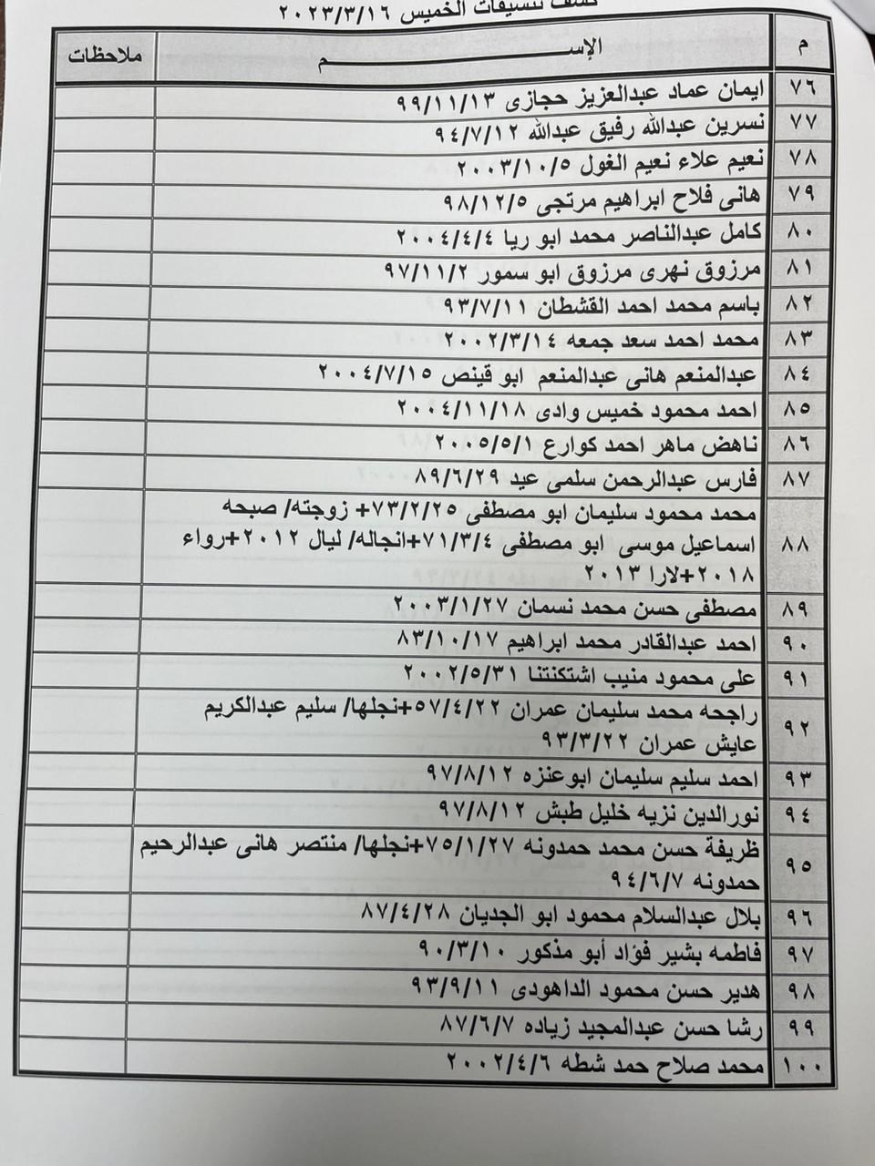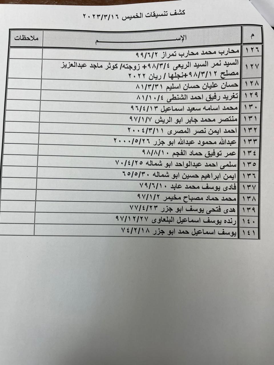 تعلن الهيئة العامة للمعابر والحدود بوزارة الداخلية والأمن الوطني عن وصول كشف "تنسيقات مصرية" للسفر عبر معبر رفح البري يوم الخميس (16 مارس)، والذين عليهم التواجد س 7:00 صباحاً في الصالة الخارجية للمعبر لتسهيل سفرهم.