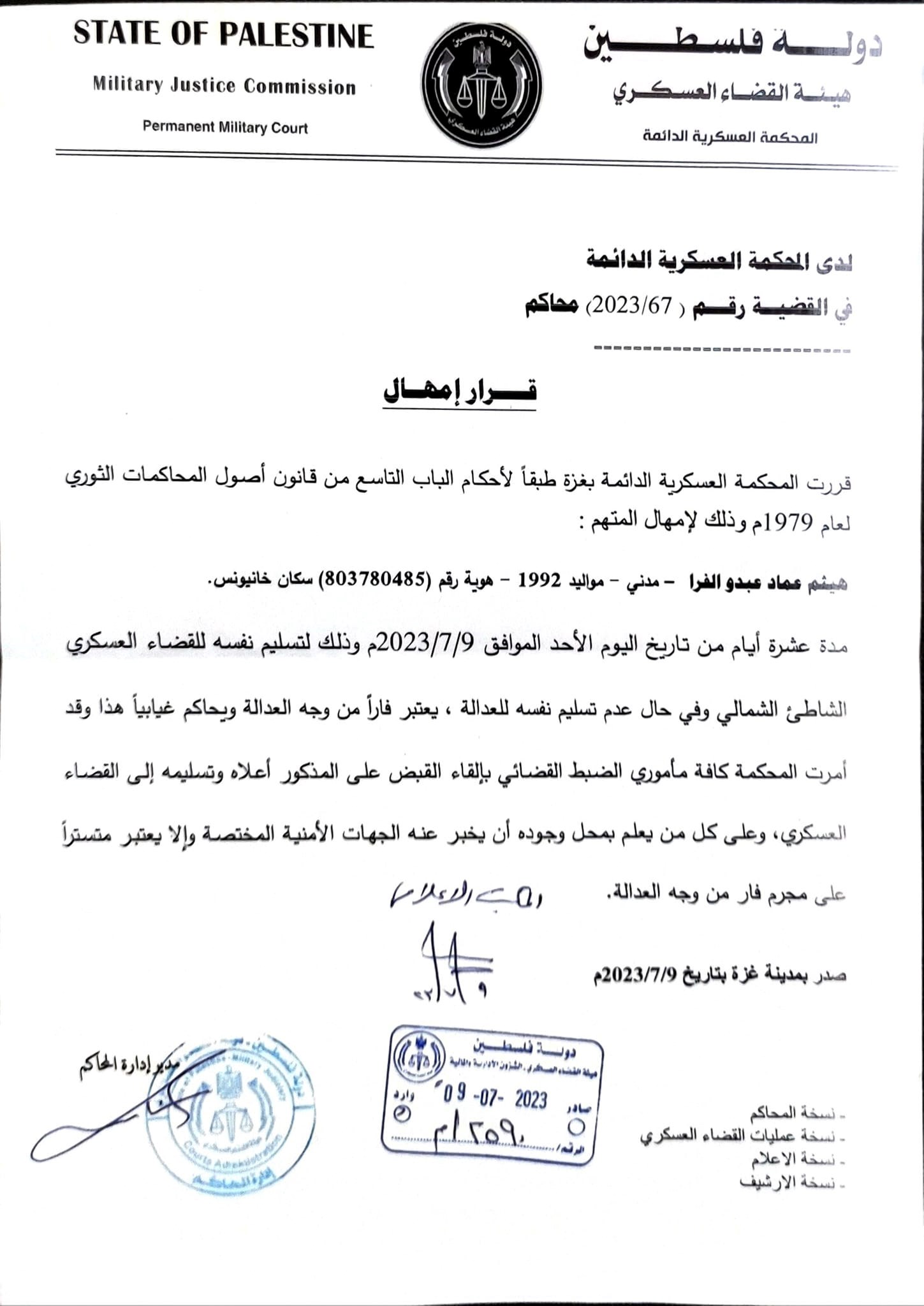 أمهلت المحكمة العسكرية الدائمة- التابعة لهيئة القضاء العسكري المتهم هيثم عماد عبدو الفرا، هوية رقم (803780485) سكان خان يونس، عشرة أيام من تاريخ اليوم الأحد الموافق 09/07/2023م، لتسليم نفسه للقضاء العسكري.