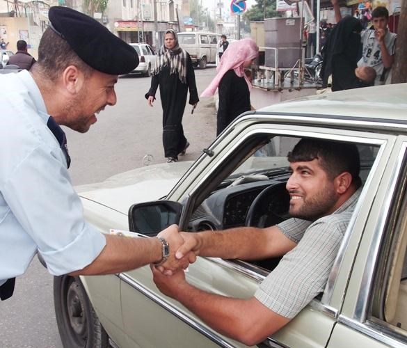 The political and moral Guidance commission had shared the officers and members of the police station to distribute olive flowers to the drivers and passengers and passers-by on Salah Al-Din, and at this year's campaign of "citizen's dignity policeman's prestige."