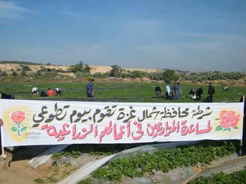 شاهد المواطنون في شمال غزة صباح يوم الخميس جموع غفيرة من أبناء الشرطة الفلسطينية تنزل إلي أراضي المزارعين وتساعدهم في حقل أراضيهم وحرثها من النباتات الضارة التي قد تضر بمحصول الفراولة.