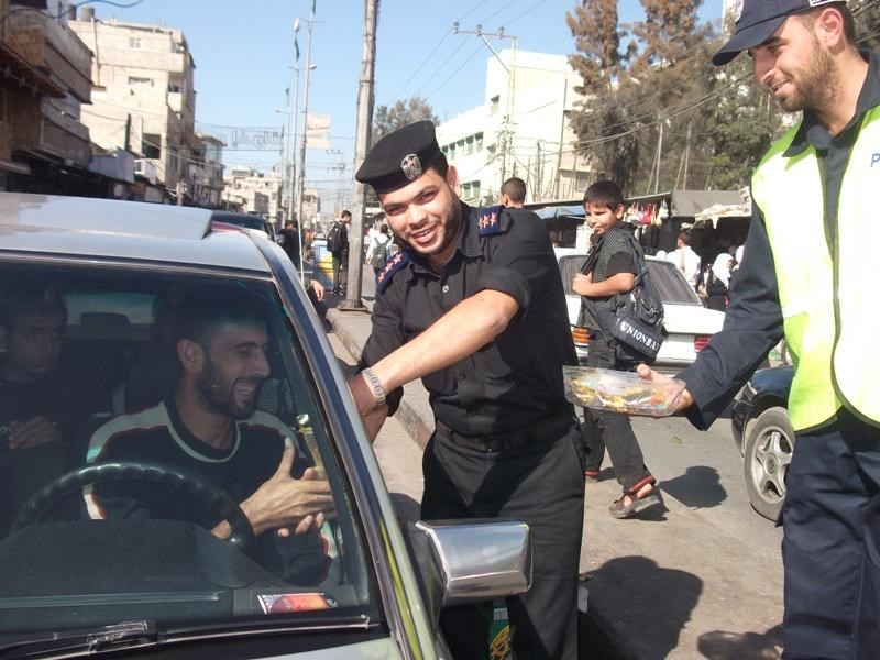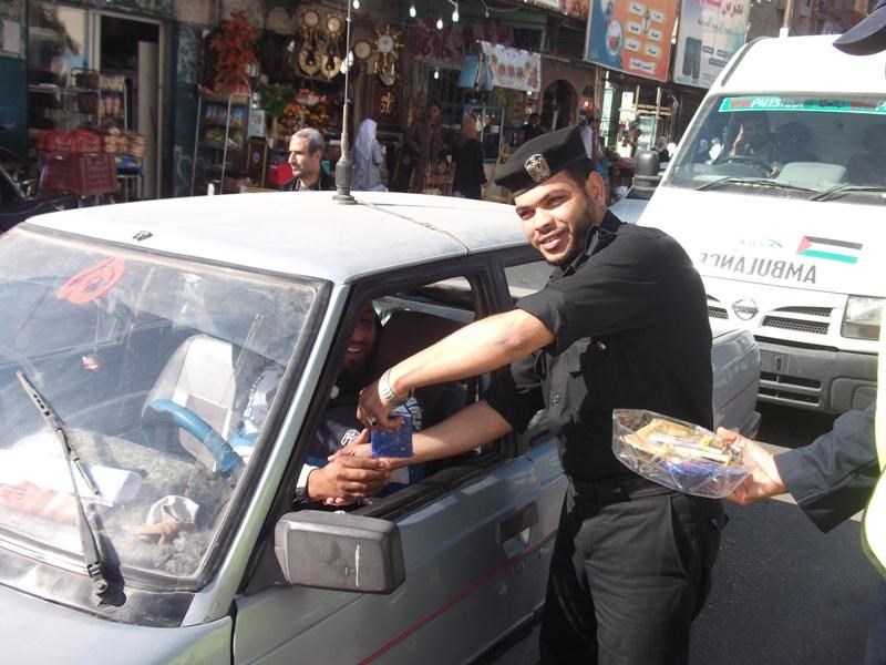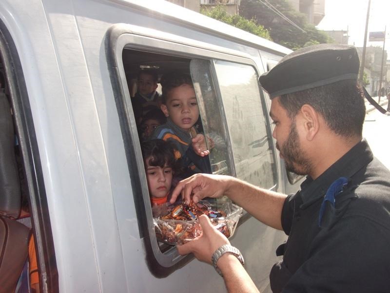 رفح/ الداخلية ضمن جهودها المتواصلة في حملة كرامة المواطن وهيبة الشرطي قامت شرطة المرور بمحافظة رفح بتوزيع الهدايا والحلوى على سائقي السيارات في جميع مفترقات المحافظة وذلك ضمن حملة ال50 يوم. حيث تقدم النقيب وائل الهمص مدير إدارة شرطة المرور بالمحافظة وعدد من ضباط المرور بتوزيع الحلوى والكتيبات الإسلامية علي السائقين والركاب في جميع مفترقات المحافظة. وأكد الهمص أن هذا العمل ينم عن وجود الشرطة في كل مكان ولها بصمة في الشارع الفلسطيني. بدورهم أشاد السائقين والركاب بهذه الخطوة من طرف الشرطة ودور الشرطة الفلسطينية الفعال في خدمة الوطن والمواطن، ومساندة أبناء شعبها في هذه الحملة.