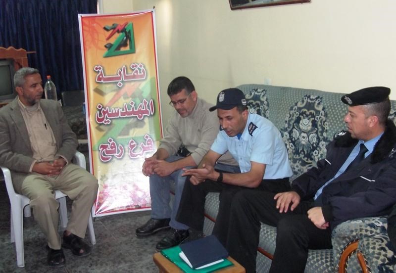 و في نفس السياق زار وفد رفيع من قيادة شرطة رفح بقيادة الرائد منير رشوان إلي نقابة المهندسين برفح والتقي الوفد الزائر بالمهندس صالح جرغون وعبر الطرفان علي سعادتهم بمثل هذه الزيارات والتقي الرائد منير رشوان بعدد من المهندس.