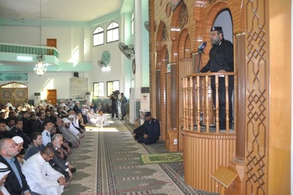 أدى العشرات من قادة وضباط وأفراد الشرطة الفلسطينية بمحافظة غزة صلاة الجمعة لهذا اليوم (3/12) خلف رئيس الوزراء الفلسطيني الدكتور إسماعيل هنية في مسجد الشاطئ الكبير بمخيم الشاطي غرب مدينة غزة بحضور لفيف من وزراء الحكومة ونواب المجلس التشريعي وحشد كبير من أهالى المخيم. وألقى العقيد يوسف الزهار مدير عام جهاز الدفاع المدني الخطبة المركزية أمام جمع غفير من أفراد وعناصر الشرطة الفلسطينية بمحافظة غزة. شخصيات اعتبارية وشارك في الخطبة إلى جانب رئيس الوزراء عدد من وزراء الحكومة تقدمهم الأمين العام لمجلس الوزراء د. محمد عوض ووزير الزراعة د. محمد الأغا ووزير العمل أحمد الكرد ووزير العدل محمد فرج الغول ووكيل وزارة الخارجية د.أحمد يوسف إضافة للناطق باسم الحكومة الأستاذ طاهر النونو. وشارك في أداء خطبة الجمعة بالمسجد الغربي عدد من قادة حركة حماس والناطقين باسمها تقدمهم د.صلاح البردويل و د.سامي أبو زهري والأستاذ فوزي برهوم ولفيف من الدعاة والمثقفين والشخصيات الاعتبارية. كما حضر الخطبة وزارة الداخلية العميد جمال الجراح قائد الشرطة ونائبه العميد تيسير البطش وعدد من قادة الأجهزة الأمنية من بينهم قائد جهاز الأمن الداخلي والمراقب العام د. حسن الصيفي ورئيس هيئة التوجيه السياسي والمعنوي الدكتور أنور البرعاوي وقيادة حملة الكرامة والهيبة العقيد كمال أبو ندى المتحدث الرسمي باسم الداخلية المهندس إيهاب الغصين والمقدم معتز الخالدي مدير العلاقات العامة بالشرطة. وخلال إلقاءه خطبة الجمعة أكد العقيد يوسف الزهار أن حملة "كرامة المواطن وهيبة الشرطي" التي أطلقتها وزارة الداخلية في السابع من نوفمبر الماضي تقوم على حماية أبناء الشعب الفلسطيني بكافة شرائحهم وتعزيز صمودهم وتوطيد أواصر التعاون المتبادلة بين المواطن ورجل الأمن. وقال الزهار أمام جمع غفير من المصلين :"هذه الحملة تحمل عنواناً عظيماً وجاءت لتجسد حقيقة كيفية حماية الشرطي الحكيم ابن شعبه المواطن الكريم". علاقة وطيدة وأكد مدير عام الدفاع المدني على ضرورة التمسك بواقع العلاقة الوطيدة بين المواطن ورجل الشرطة، موضحاً أن التمسك به يساعد في حماية أمن الوطن والمواطنين الفلسطينيين. وأشار العقيد الزهار إلى أن حملة كرامة المواطن وهيبة الشرطي لا تنتهي بعد انتهاء المدة الزمنية المرفقة لها خمسون يوماً، عاداَ المدة الزمنية المقررة للحملة حلقة أولية من الحملة تنتهي ببوادر افتتاح جمعية أصدقاء الشرطة بعد تاريخ السابع والعشرين من كانون أول (ديسمبر) الجاري موعد اختتام فعاليات الحملة. وأضاف أن "هذه الجمعية التي ستشكل نهاية فترة حملة الكرامة والهيبة ستسعى لتجسيد واضح للحمة والعلاقة بين المؤسسة الشرطية والأمنية من جهة وأبناء الشعب الفلسطيني من جانب آخر". وشدد الزهار على أن اللحمة بين أفراد الشرطة وأبناء شعبهم لن تنفك بأي شكل من الأشكال، وتابع "هذه الحملة تحظى باهتمام بالغ من الحكومة ممثلة برئيس الوزراء الذي يؤكد دوماً أن الحكومة لن تسمح لأي كان بإهانة كرامة المواطن". وأشاد العقيد الزهار بصمود أبناء الشعب الفلسطيني في مواجهة الحصار الصهيوني الظالم المضروب على قطاع غزة منذ أكثر من أربع سنوات على التوالي إلى جانب صموده التاريخي في معركة الفرقان شتاء العام 2008-2009، منوهاً أن الشعب الفلسطيني يستحق كل خير وتكريم من قيادته. واستعرض مدير الدفاع المدني خلال خطبة الجمعة صفات الأمة التي كتب الله لها التمكين والنصر والسداد والاستخلاف في الأرض، مبيناً أن الأمن والاستخلاف لا يكون إلا لعباد الله. ومضى يقول :"اليوم نسير على أرض قطاع غزة آمنين ولا أحد فوق القانون لا شرطي ولا مواطن عادي (..) الكل سواسية من يخطأ يحظى بالجزاء ومن يحسن يحظى كذلك بالجزاء على تصرفه وهذا هو الأمن الذي يسعى الإسلام إليه". وفي ختام خطبته هنأ حجاج بيت الله الحرام من أبناء شعبنا الفلسطيني الذين عادوا لأرض الوطن خلال الأيام الماضية بعد أدائهم فرضية الحج لهذا العام، وتمنى لهم حجاً مبروراً