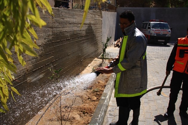 بدوره قال النقيب محمد عسلية مدير مركز الدفاع المدني في بيت لاهيا " إن دور الدفاع المدني اليوم في العمل التطوعي يتمثل في مشاركة باقي الأجهزة الأمنية من خلال سقاية الزرع والأشتال الزراعية وترطيب الأرض من خلال رشها بالماء " .