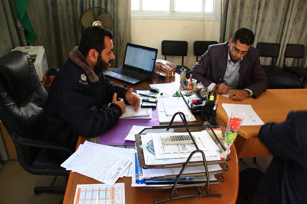 انهمك الرقيب أول مهند شبانة مسئول الأرشيف في مركز شرطة الشيخ رضوان بداخل مكتبه في العمل على أرشفة ملفات وأوراق مكاتب المركز وشكاوى المواطنين وإدخال البيانات عبر جهاز الماسح الضوئي داخل جهاز الكمبيوتر المركزي .