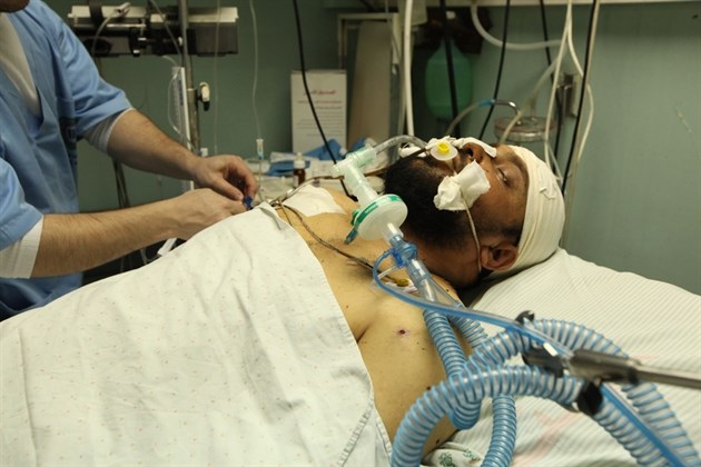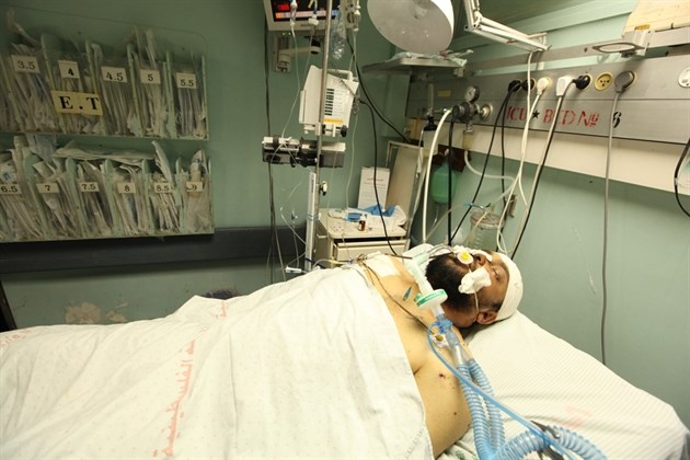 لم تستطع المواطنة الفلسطينية أم مصباح الداية حبس دموعها التي تساقطت بغزارة من مقلتيها وهي تضع يدها على جبين ولدها المصاب "مدحت" 20 ربيعاً وهو أحد أفراد الأمن الوطني الذين أصيبوا في القصف الصهيوني الغاشم على موقع الكتيبة الثانية شرق مدينة غزة صباح السبت.