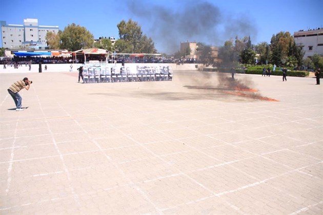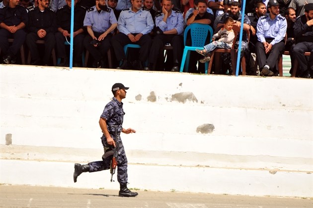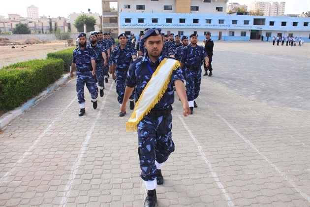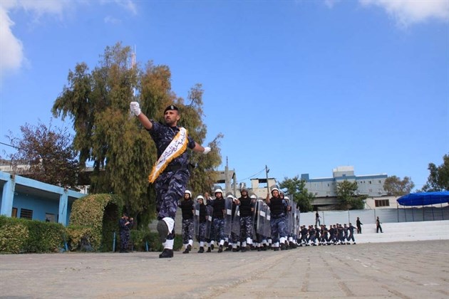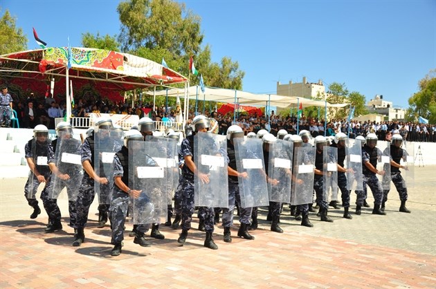 وتقدمت أفراد الشرطة المشاركين في العرض على أنغام النشيد الوطني الفلسطيني بكافة وحداتهم وأقسامهم أمام حشود المشاركين في احتفال تخريج الدورة الشرطية الأولى من نوعها في قطاع غزة وعلى يمنيهم يقف قائد الشرطة وكبار مساعديه.