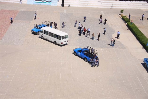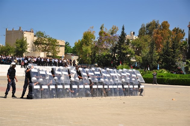 وتخلل احتفال التخريج كذلك عرضاً لقوات مكافحة الشغب تمثل في تفريق متظاهرين خارجين عن القانون قاموا برجم عناصر الشرطة بالحجارة.