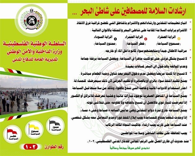 أصدرت المديرية العامة للدفاع المدني بوزارة الداخلية سلسلة إرشادات السلامة للمصطافين على شاطئ البحر في قاع غزة خلال فصل الصيف دعت فيها المواطنين لإتباع تعليمات المنقذين وإرشاداتهم والالتزام بالمناطق التي تخضع لمراقبة فرق الإنقاذ.