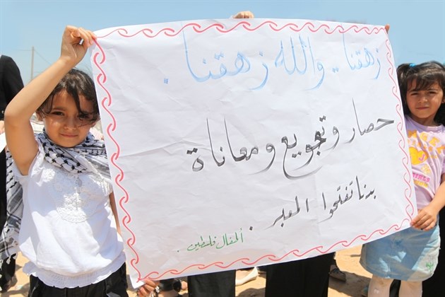 وتلت الطفلة سهام الدالي بيان الأطفال المعتصمين وقالت :"جئنا نحمل في يد زهرة طفولتنا وفي اليد الأخرى كفناً ينتظرنا وعيوناً ترقب الأمل من خلف السياج أمام الحدود المصرية".