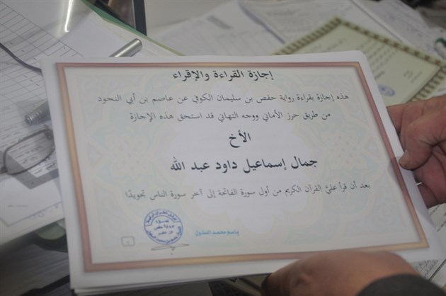 وسلم الأستاذ يوسف الكحلوت مدير قسم القراءات في دار القرآن الكريم والسنة شهادة الإجازة للواء الجراح .