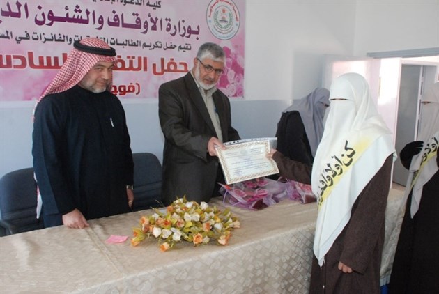 هذا وتخلل الحفل كلمة للطالبات المتفوقات ألقتها إحدى الطالبات المتفوقات دعت فيها الطلبة على مقاعد الدراسة بالجد والاجتهاد لتحمل المسؤولية الربانية الملقاة على عاتقهم، متقدمةً بالشكر والتقدير لوزارة الأوقاف والعاملين في الكلية على الجهود التي يبذلوها في خدمة الطلبة وتوفير كل ما يلزمهم.