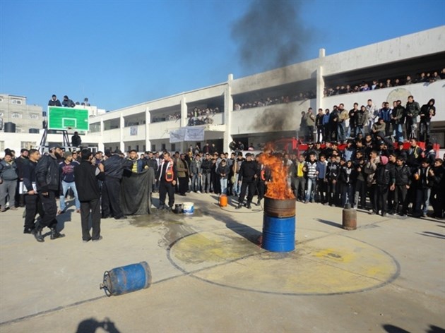 وتضمنت الأنشطة الجانبين النظري والمهني على عمليات الإخلاء الآمن للمدارس في حالات القصف الإسرائيلي وتدريب على عمليات الإطفاء والسلامة المنزلية داخل البيوت.