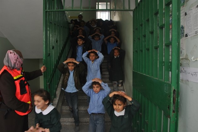 حيث نقل الطلاب من الفصول إلى مكان التجمع الآمن، وبتنظيم على مستوى عال من أعضاء الهيئة التدريسية وبإشراف من طواقم الدفاع المدني.