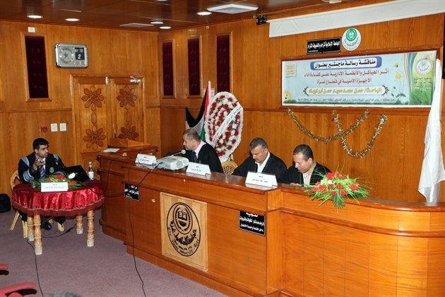 وكانت اللجنة المناقشة التي ترأسها الدكتور سامي أبو الروس قد منحت الطالب درجة الماجستير بعد مناقشة مستفيضة لرسالته التي بعنوان (أثر الهياكل والأنظمة الإدارية على كفاءة أداء الأجهزة الأمنية في قطاع غزة).