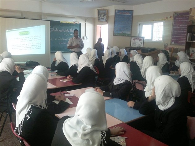 Capt. Zaher Abu Hoichl , and Lt. Mo'az Hassan , talked for the dozens of students in Bureij secondary school for girls about the means of collaboration with occupation , and mobile and Internet risks ways of preventing this means and how to respond to them..