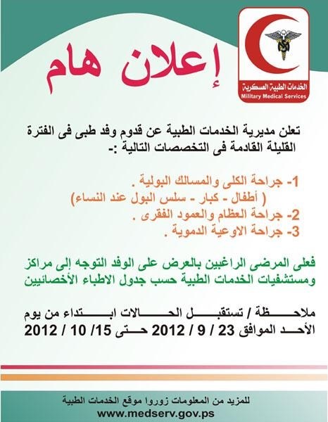 ودعت المواطنين الراغبين بالتعرف على مزيد من المعلومات حول الوفد الطبي ومواعيد المراجعة على الأخصائيين لزيارة موقعها الالكتروني على الشبكة العنكبوتية http://www.medserv.gov.ps/.