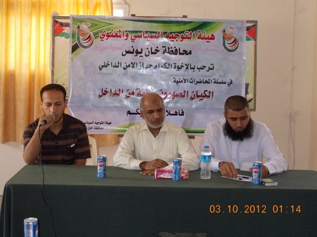 نظمت هيئة التوجيه السياسي والمعنوي بمحافظة خان يونس لقاءً سياسيًا لجميع قوة جهاز الأمن الداخلي بالمحافظة وذلك ضمن سلسلة اللقاءات الأمنية التي بعنوان "الكيان الصهيوني نظرة من الداخل" والتي يحاضر فيها المختصون بالشأن الصهيوني.
