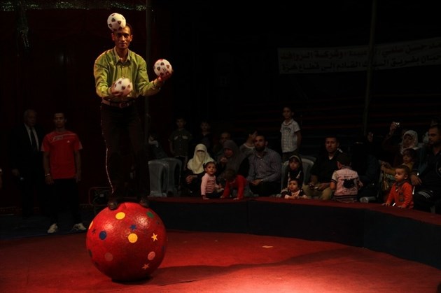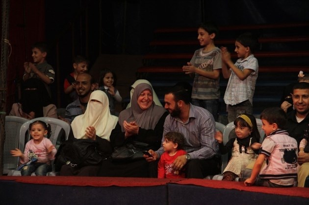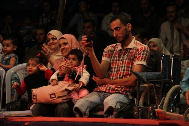 وعبر الجريح الفلسطيني عن بالغ سعادته وأطفاله وأهله بالعروض الشيقة التي تابعها في السيرك الذي يعرض لأول مرة في القطاع.
