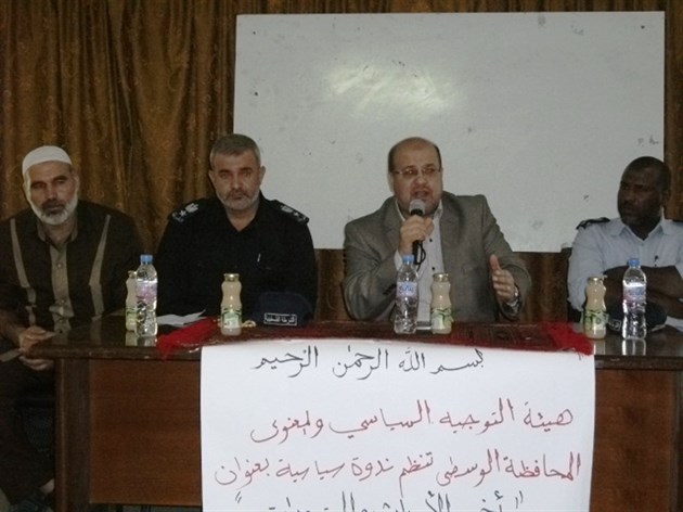 نظمت هيئة التوجيه السياسي والمعنوي في المحافظة الوسطى لقاء سياسيا للأجهزة الأمنية بالمحافظة الوسطى بعنوان "آخر المستجدات السياسية على الساحة الفلسطينية" في قاعة بلدية النصيرات بحضور 200 عنصر من الأجهزة الأمنية.