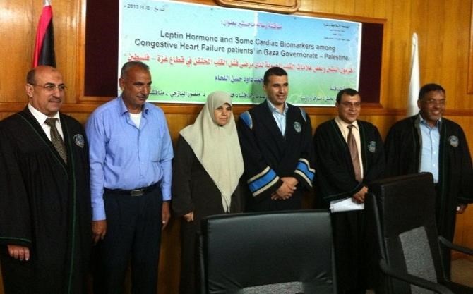 وقررت اللجنة المشرفة على الرسالة بعنوان هرمون اللبتين وبعض علامات وظائف القلب الحيوية لدى مرضى فشل القلب المحتقن في قطاع غزة.