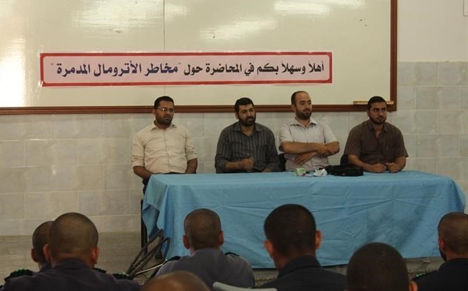 غزة / الداخلية / جهاد سمعان عقدت كلية الشرطة الفلسطينية بالتعاون مع هيئة التوجيه السياسي و المعنوي التابعة لوزارة الداخلية و الأمن الوطن محاضرة بعنوان "مخاطر الأترمال المدمر" ضمن الحملة التي تنظمها الوزارة حول مضار الحبوب المخدرة. وأكد أستاذ نبيل حجاج مدير التوجيه السياسي و المعنوي في محافظة غزة على ضرورة توعية أبناء الشعب الفلسطيني بأخطار هذا العقار المدمر وما لها من آثار سلبية على المجتمع ككل وعلى الشخص المتعاطي له بالأخص. ومن جانبه وضح أستاذ أشرف أبو سيدو رئيس قسم التوعية في مكافحة المخدرات في الشرطة الفلسطينية خطر هذه الحبوب المخدرة موضحاً مدى تأثيرها على نفسية المتعاطي وسلوك بعض الحالات التي وقعت في وحل هذا الإدمان مما أدى إلى دمار الكثير من الطبقات المجتمعية وخاصة الفئات الشبابية.