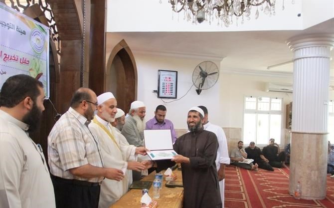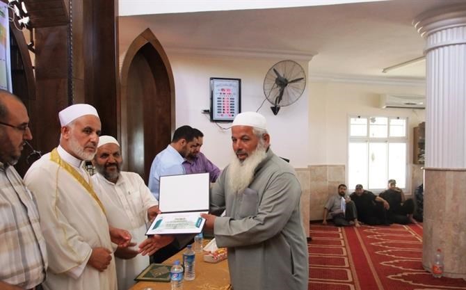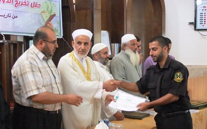 خانيونس / الداخلية / إعلام التوجيه السياسي: نظمت هيئة التوجيه السياسي والمعنوي بمحافظة خان يونس حفلاً لتخريج الدورات الشرعية ودورات أحكام التلاوة والتجويد التي نفذتها من بداية العام الحالي حتى نهاية شهر يونيو المنصرم. واستهدفت هذه الدورات أكثر من (250) ضابطًا وفردًا من أبناء الأجهزة الأمنية، وتنوعت عناوين وموضوعات الدورات مثل (العقيدة الإسلامية، السيرة النبوية، نضرة النعيم في أخلاق الرسول الكريم، تزكية الأنفس، ودورات أحكام التلاوة والتجويد التأهيلية والعليا وتأهيل السند)، إضافةً إلى دورات التنمية البشرية الواقعة في الفترة المذكورة أعلاه وهي (دورة القيادة الإسلامية، ودورة فن التعامل مع الجمهور). وتحدث ضيف الحفل النائب في المجلس التشريعي الفلسطيني الدكتور يونس الأسطل عن آخر المستجدات وتداعيات الوضع المصري على الساحة المصرية والعربية والعالمية. ومن ثم تحدّث عن أهمية دورات القرآن الكريم، وأهميتها في بناء الجيل القرآني وتأسيس جيل النصر والعودة. وقال إن بناء العقيدة والدين في نفوس الرجال لهو أهم من حملهم السلاح. وفي نهاية كلمته شكر هيئة التوجيه السياسي والمعنوي والقائمين على هذا الحفل وهذه الدورات الرائعة والمشرفة، كما وشكر وزارة الداخلية التي تشرف على كل هذه الأنشطة والفعاليات وتوفر الجو والمناخ المناسب لها. وتم استعراض نموذجين من الإخوة الذين شاركوا في دورات أحكام التلاوة من الذين أنهوا دورة تأهيلية وعليا، حيث قرأ كلٌ منهما ما تيسر من القرآن الكريم أمام الحضور. وأتحف الحضور الأخ المنشد محمد عماد العبادلة بأنشودة رائعة، ومن ثم كرم مدير مكتب خان يونس الرائد إسماعيل الأسطل، والنائب الأسطل، ومدير أوقاف خان يونس السابق الشيخ سعيد زعرب الإخوة المشاركين في الدورات المذكورة حيث سلموهم شهادات التقدير الخاصة بهم كلٌ حسب دورته التي أنهاها.
