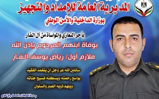 غزة / الداخلية / بهاء خلف: نعت المديرية العامة للإمداد والتجهيز بوزارة الداخلية والأمن الوطني الثلاثاء أحد كوادرها الملازم أول رياض الفار. وتقدم مدير عام الإمداد والتجهيز العميد محمود شاهين وضباط وضباط صف وكافة أفراد المديرية بأحر التعازي والمواساة لآل الفار الكرام بوفاة ابنهم المرحوم بإذن الله تعالى ملازم أول رياض الفار. وقالت الإمداد والتجهيز في بيان مكتوب وصل موقع الداخلية نسخة عنه "نسأل المولى عز وجل أن يتغمد الفقيد بواسع رحمته وأن يسكنه فسيح جناته وأن يلهم اهله وذويه الصبر والسلوان" . وتُوفي الشاب "الفار" بعد صراع مع مرض ألم به مؤخراً ويعمل في مديرية الإمداد والتجهيز بالداخلية.