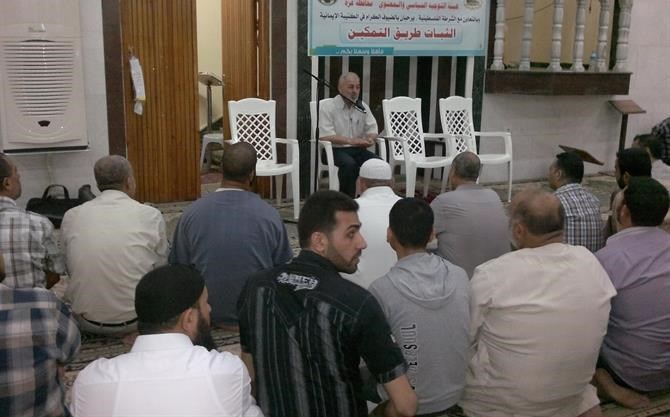 غزة / إعلام التوجيه السياسي: نظمت هيئة التوجيه السياسي والمعنوي بمحافظة غزة كتيبة إيمانية لضباط وجنود شرطة البلديات وأمن التشريعي والشرطة القضائية في المحافظة. واستضافت الهيئة في هذه الكتيبة التي عقدت في مسجد أبو خضرة ووزير العدل الأسبق الأستاذ محمد فرج الغول، والعميد محمود عزام رئيس هيئة التوجيه السياسي والمعنوي. وشارك في الكتيبة أ. نبيل حجاج مدير محافظة غزة والرائد مجدي أبو حطب مدير شرطة البلديات والرائد أحمد أبو العيس مدير الشرطة القضائية والرائد أحمد شحادة مدير شرطة أمن التشريعي، إضافة إلى نحو 150 ضابطاً وجندياً من الشرطة. وبدأت الكتيبة الإيمانية بصلاة ركعتي قيام للملازم محمد أبو هويدي، ومن ثم تحدث الملازم أول محمد شابط عن برنامج الكتيبة والفقرات التي ستكون ونعيش معها. وتحدث النائب الغول تحث عنوان " الثبات طريق التمكين " وطالب العناصر الشرطية بحماية المشروع والذود عن حياضه والتمسك برضى الله ونصرة دينه لأنه أساس النصر والتمكين. وشرح الغول قوله تعالى " يثبت الله الذين آمنوا بالقول الثابت في الحياة الدنيا وفي الآخرة ويضل الله الظالمين ويفعل الله ما يشاء". وبين أن الثبات مطلوب في كل المراحل وخاصة في الثبات على الدين والثبات في الفتن وذكر أنواع الفتن ومنها فتنة الجاه, و فتنة الزوجة والنساء , فتنة الاضطهاد والطغيان والظلم وفتنة الدجال وفتنة المال, ومن المواطن أيضا الثبات على الجهاد. بدوره، تحدث الاستاذ نبيل حجاج في كلمة الهيئة عن أهمية اخلاص النية لله عز وجل والتغذية الروحية حتى يسير الواحد فيها بشقيه المادي والمعنوي لأن الجسد يحتاج الي غذا وهو الطعام أما الروح فغذاؤها التعبد وقيام الليل. وتخلل برنامج الكتيبة صلاة قيام ليل ودعاء وابتهال روحاني ودرس إيماني إضافة إلى عرض مرئي LCD.
