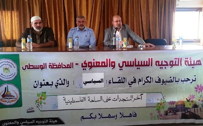 الوسطى / إعلام التوجيه السياسي: نظمت هيئة التوجيه السياسي والمعنوي في المحافظة الوسطى لقاءً سياسياً لضباط الأجهزة الأمنية في المحافظة بعنوان "آخر المستجدات على الساحة الفلسطينية " بحضور قادة الأجهزة الأمنية والشرطية بالمحافظة. واستضافت الهيئة في هذا اللقاء الذي حضره نحو 120 ضابطاً من مختلف الأجهزة الأمنية الأستاذ عصام الدعاليس مستشار رئيس الوزراء الفلسطيني. وتحدث الأستاذ الدعاليس عن الأوضاع المصرية الجارية وأثرها على القضية الفلسطينية، وعن المؤامرات الكبيرة والعالمية ضدَّ من يريد أن يرفع راية الإسلام عالياً. كما تحدث عن الحصار الاقتصادي والمالي والأوضاع بسبب إغلاق الأنفاق ومعبر رفح وغيرها من المحاولات اليائسة، وعن المفاوضات الحالية بين السلطة الفلسطينية والاحتلال. وأشار الأستاذ الدعاليس إلى أثر التهديدات الصهيونية بما يخص التصعيد ضد قطاع غزة. وفي نهاية اللقاء كرم مدير مكتب الهيئة في المحافظة الوسطى المقدم بسام أبو الريش الأستاذ الدعاليس على جهوده في دعم ومساندة أنشطة الهيئة على جميع الأصعدة. وتم تكريم المقدم فؤاد أبو بطيحان مدير شرطة المحافظة الوسطى بمناسبة حصوله على درجة الماجستير أيضا.