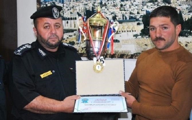 كرم مدير عام الشرطة الفلسطينية العميد تيسير البطش العريف صبحي شعبان صبحي أبوعاصي بعد حصوله على المركز الأول في بطولة القطاع المفتوحة لكمال الأجسام والتي عقدها الإتحاد الفلسطيني بصالة سعد صايل بمدينة غزة.
