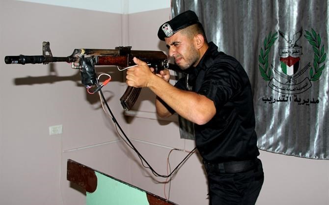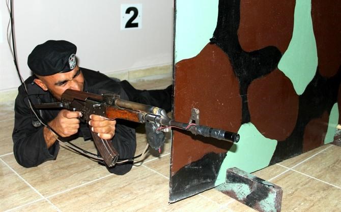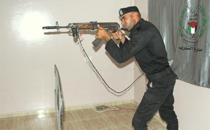 وفي مقدمة القاعة في الطابق الأرضي في مبنى التدريب وضع شاخصان خشبيان للتهديف، وفي الجهة المقابلة أقيم حاجزان وضعت عليهما بندقيتان من طراز "كلاشنيكوف" بعد إجراء تعديلات عليهما لإطلاق أعيرة ليزر تعمل بالتيار الكهربائي.