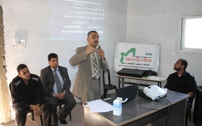 وفى كلمته خلال اللقاء أوضح النقيب محمد المغير مدير الأمن والسلامة بالدفاع المدني برفح أن هذه المحاضرة تأتي ضمن الجهود المبذولة للتعريف بالإشعاعات ودورها ومخاطرها .