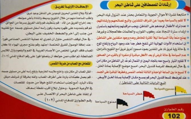 وأعلن العميد سعودي أن طواقم الدفاع المدني ستنتشر على طول الشاطئ بدءاً من اليوم وعلى مدار أيام الخميس والجمعة والسبت من كل أسبوع نشرات سيتم توزيعها على المواطنين المتواجدين على الشاطئ.
