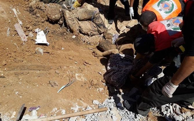 عشرات الجثث تم انتشالها من بين أنقاض المنازل المدمرة، بعضها متحلل والبعض الآخر عبارة عن أشلاء، وعدد منهم لم تُعرف هويته تم إلحاقهم بآخرين في ثلاجات الموتى التي لم تعد تطيق العدد الهائل من الشهداء.