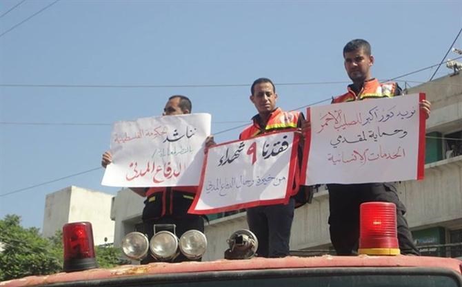 وحمل الإطفائيون يافطات كتبت عليها "نناشد الحكومة بالنظر لمعاناة الدفاع المدني ، نطالب مصر الشقيقة بالسماح لإدخال المعدات وسيارات الإطفاء ، تعرض 36 رجل دفاع مدني لإصابات مختلفة في انتهاك سافر للقانون الدولي".