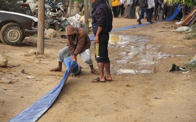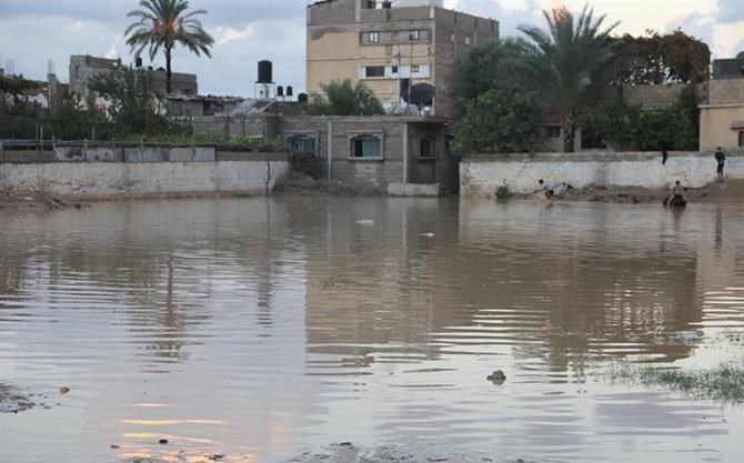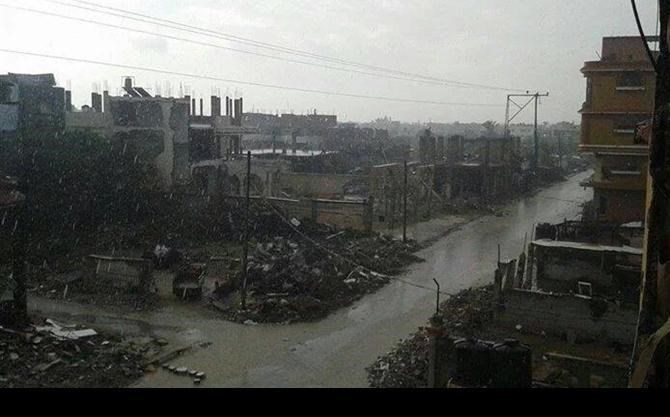 مياه الأمطار التي هطلت بغزارة أمس واليوم ، تدفقت بشكل سريع لمنطقة خزاعة المنكوبة أثناء الحرب الأخيرة التي وضعت بها الكرافانات للمواطنين على مقربة من مدخل البلدة.