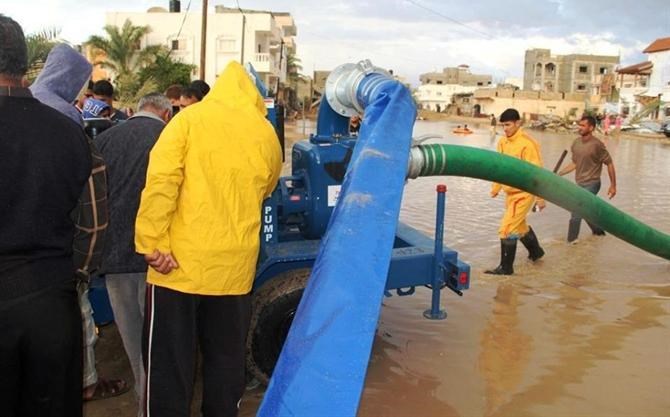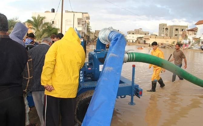 طواقم الدفاع المدني بإمكاناته المتواضعة تدخل لإنقاذ المواطنين الذين وجدوا انفسهم محاصرين وسط المياه ، حيث ذهب بآلياته إلى منطقة خزاعة المنكوبة من المطر والاحتلال.