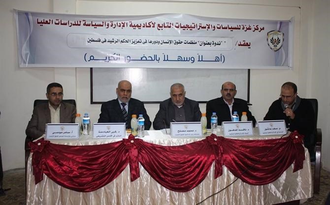 جاء ذلك خلال ندوة متخصصة نظمها مركز غزة للدراسات التابع لأكاديمية الإدارة والسياسة للدراسات العليا في مقرها بمدينة غزة ظهر الثلاثاء بعنوان "منظمات حقوق الإنسان ودورها في تعزيز الحكم الرشيد في فلسطين ".