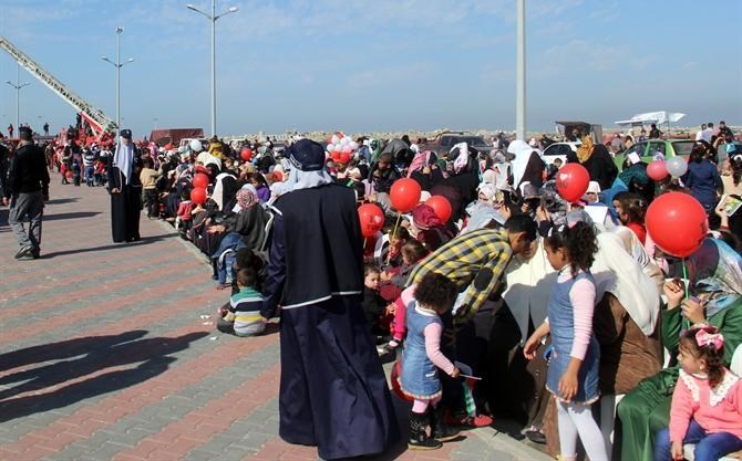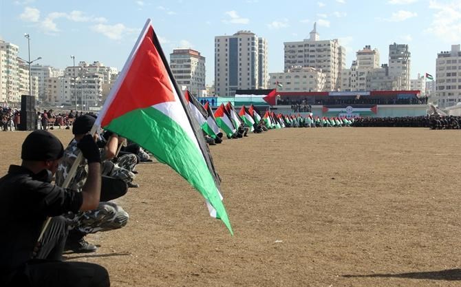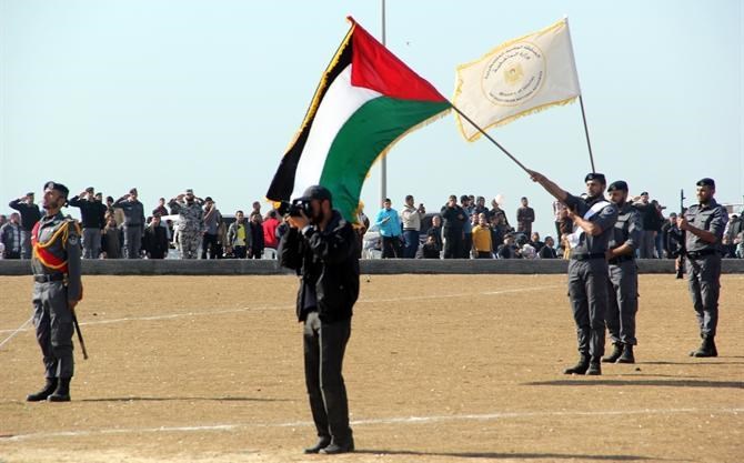 مع نسائم هواء بحرها العليل, وأصوات أمواجه الهادئة, وعلى أنغام الأناشيد الحماسية وقرع الطبول, وصخب الموسيقى العسكرية واندماجها بهتافات الجماهير المحتشدة على أرض "ميناء مدينة غزة البحري" رفرفت الأعلام الفلسطينية وشكل أكثر من 1000 ضابطا وضابط صف من خرجي فوج شهداء "معركة العصف المؤكول" بأجسادهم لوحة فنية وطنية مميزة.