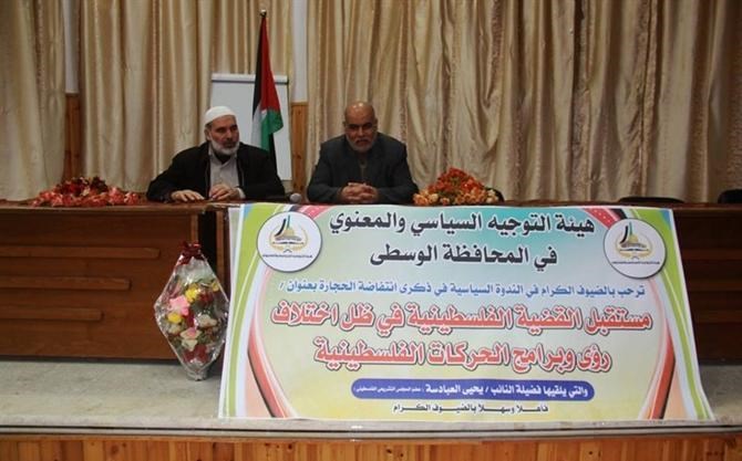 نظمت هيئة التوجيه السياسي والمعنوي بالمحافظة الوسطى لقاء سياسيا في ذكرى انتفاضة الحجارة بعنوان "مستقبل القضية الفلسطينية في ظل اختلاف الرؤى وبرامج الحركات الفلسطينية " حيث استضافت الهيئة الاستاذ يحيى العبادسة النائب في المجلس التشريعي الفلسطيني.