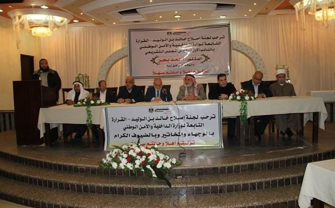 نظمت لجنة إصلاح خالد بن الوليد بالقرارة التابعة للإدارة العامة لشؤون العشائر والإصلاح بوزارة الداخلية ظهر أمس السبت لقاء خاصا جمع رجال الإصلاح والمخاتير والوجهاء ونواب محافظة خان يونس وذلك بصالة ريال بلاس بالمحافظة .