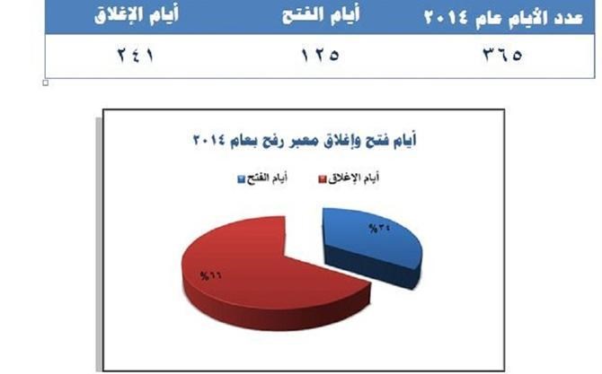 هيئة المعابر والحدود بوزارة الداخلية والأمن الوطني كشفت – في إحصائيتها السنوية لعام 2014 – أن معبر رفح تم إغلاقه لمدة 241 يوماً على مدار العام، أي تتعدى نسبته 66% من عدد أيام السنة.
