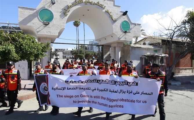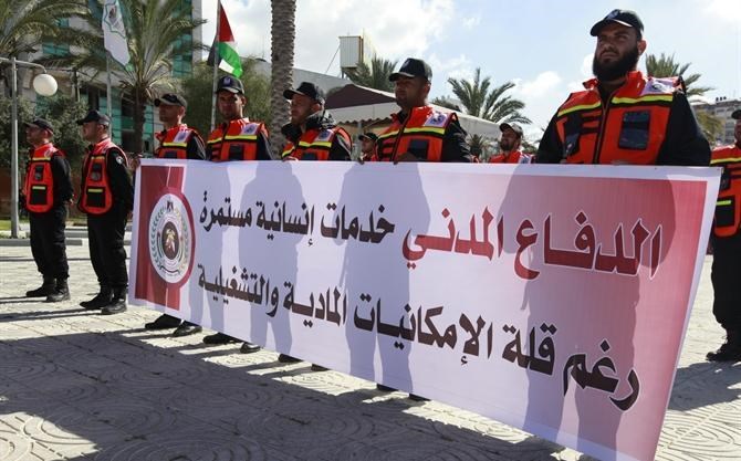 ورفع المُشاركون يافطات أكدوا من خلالها أن خدمات الدفاع المدني خدمات إنسانية مستمرة رغم قلة الإمكانيات المادية والتشغيلية , كما حمَّلوا الاحتلال مسئولية تدهور الأوضاع الإنسانية جراء استمرار الحصار المفروض على القطاع منذ عدة سنوات.