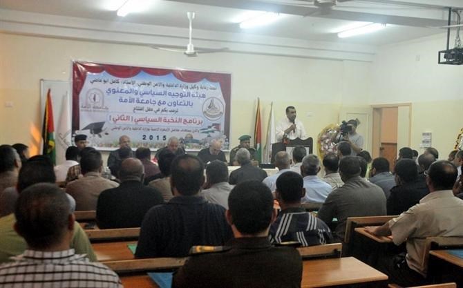 وحضر الحفل اللواء محمود عزام رئيس هيئة التوجيه السياسي والمعنوي، والدكتور نعمان علوان رئيس جامعة الأمة، وقائد قوات الأمن الوطني العميد نعيم الغول، والدكتور هشام المغاري النائب الأكاديمي لكلية العودة، والمقدم عبد الله قرموط ممثلا عن المديرية العامة للتدريب.